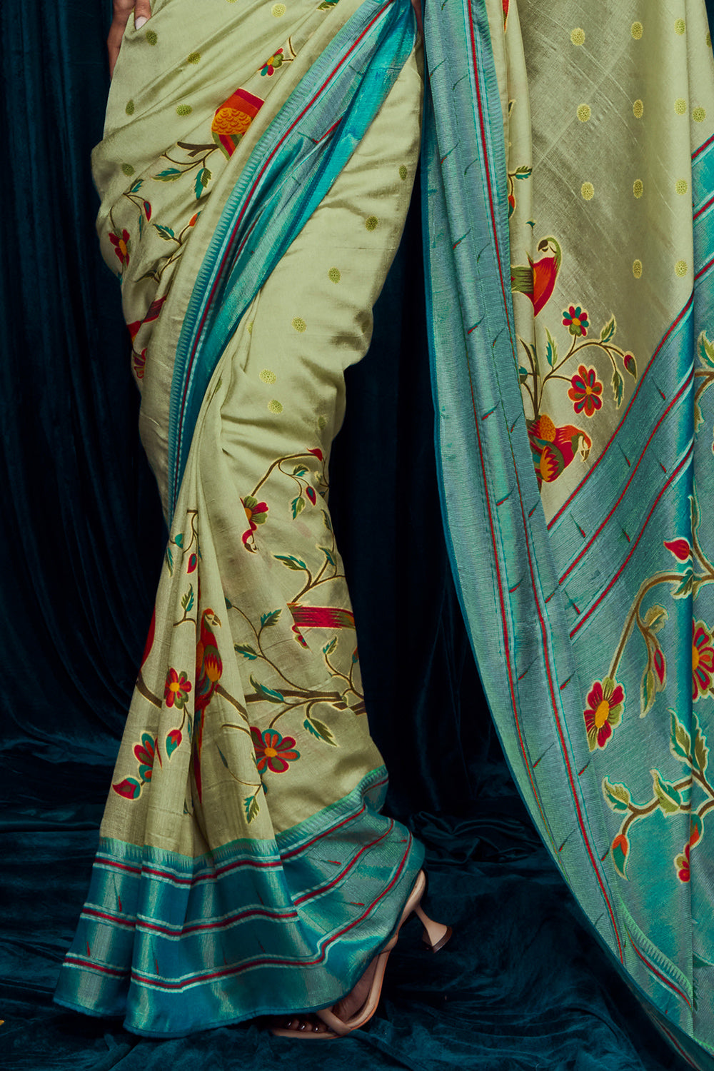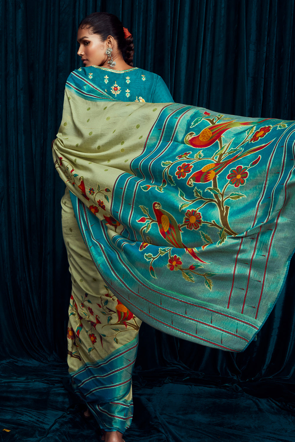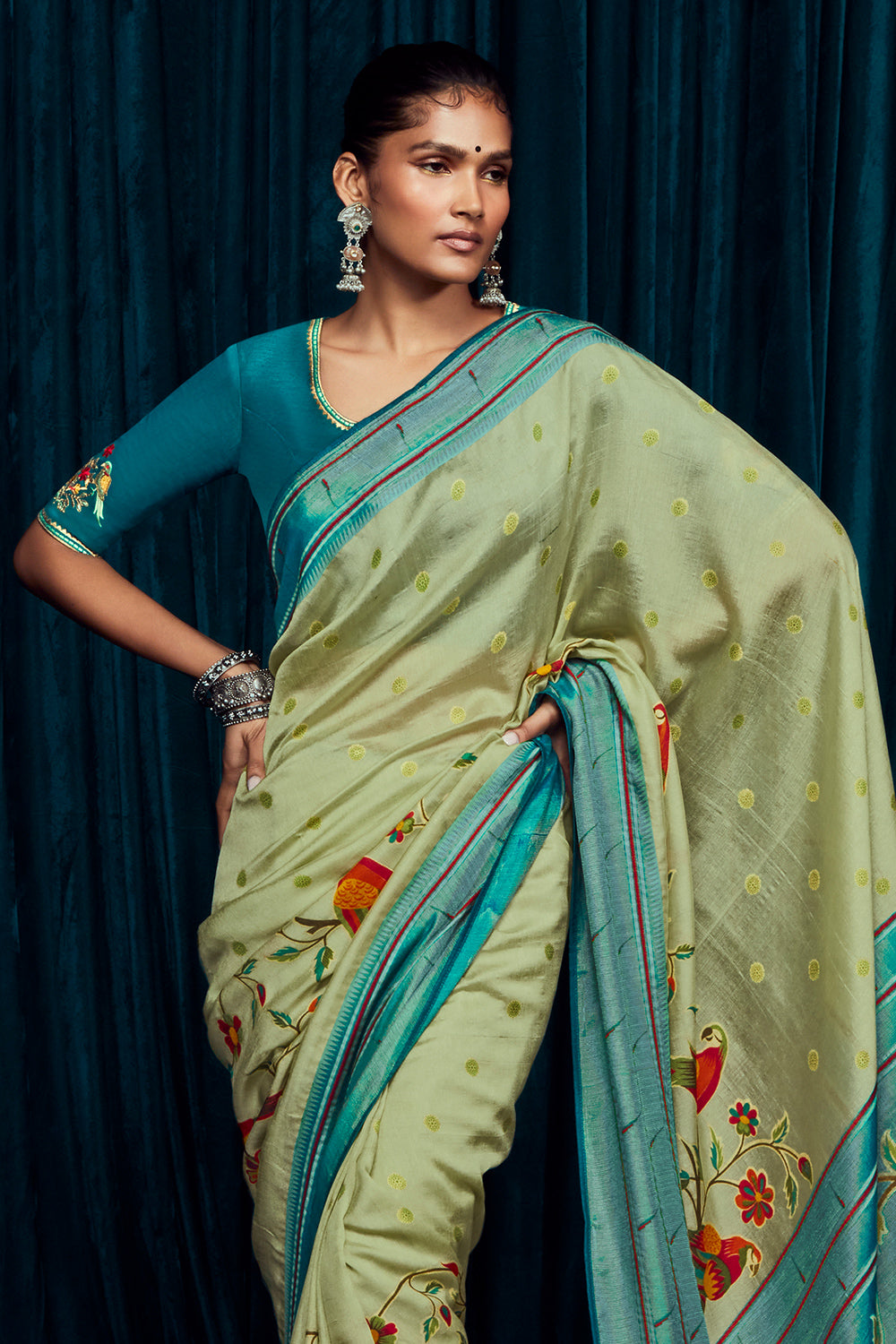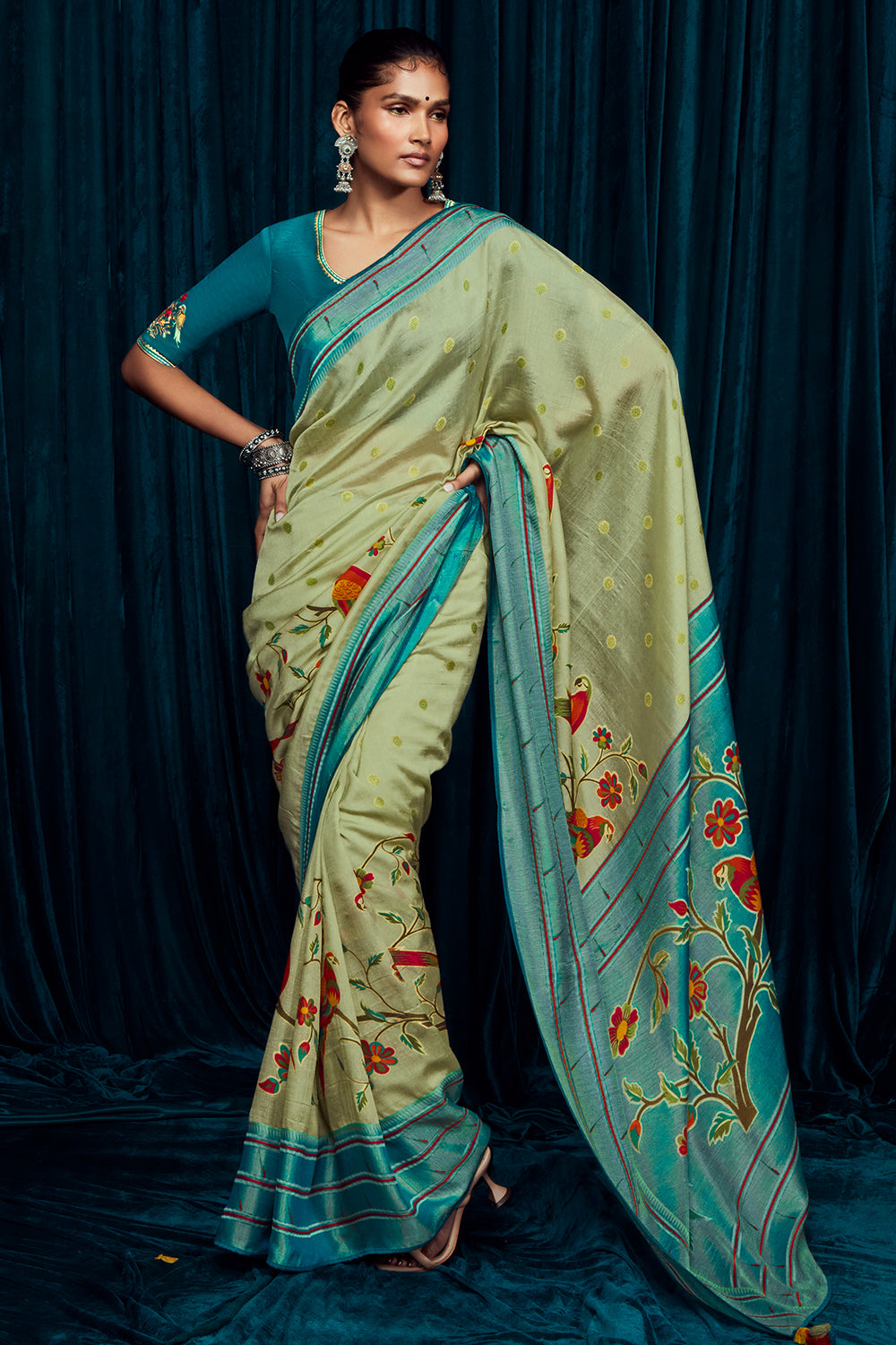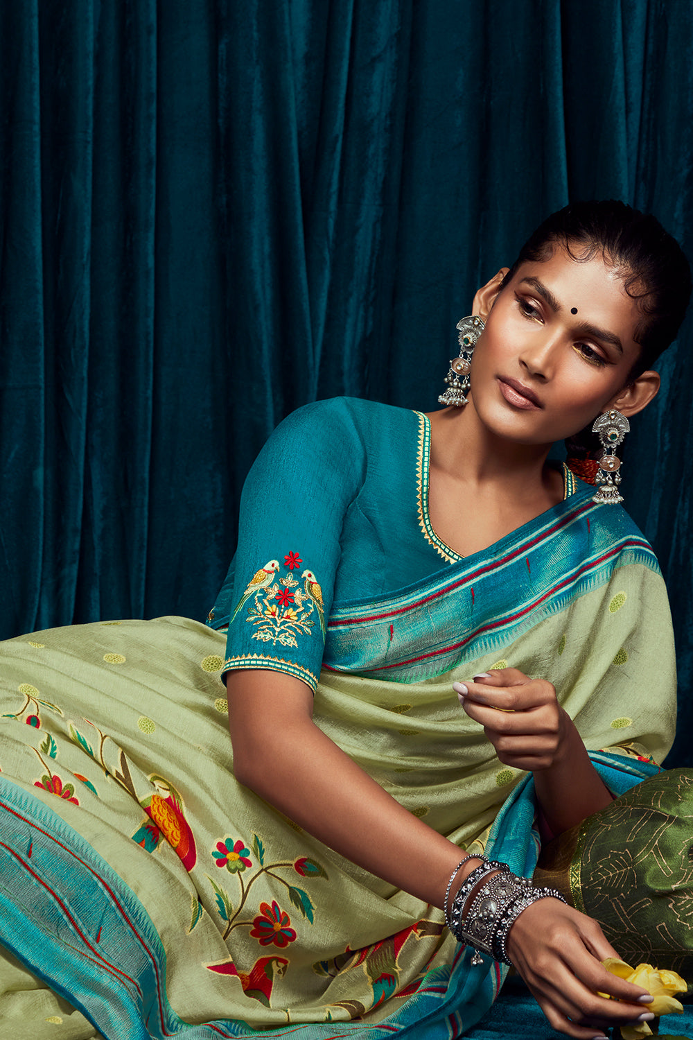 Step into an aura of serene elegance with our Sage Green Brasso Saree, an embodiment of understated sophistication. Meticulously crafted, this saree features a captivating Sage Green hue that mirrors the tranquility of nature. The unique brasso fabric introduces texture and dimension, creating a visual delight that transitions seamlessly from daytime festivities to evening events. As you drape this exquisite saree, feel the delicate fabric embrace you, casting an elegant silhouette that exudes both charm and grace. Perfect for any occasion, the Sage Green Brasso Saree promises to radiate effortless elegance, complemented by your choice of jewelry and blouse. Discover the allure of subtle beauty exclusively available on Ranreet.