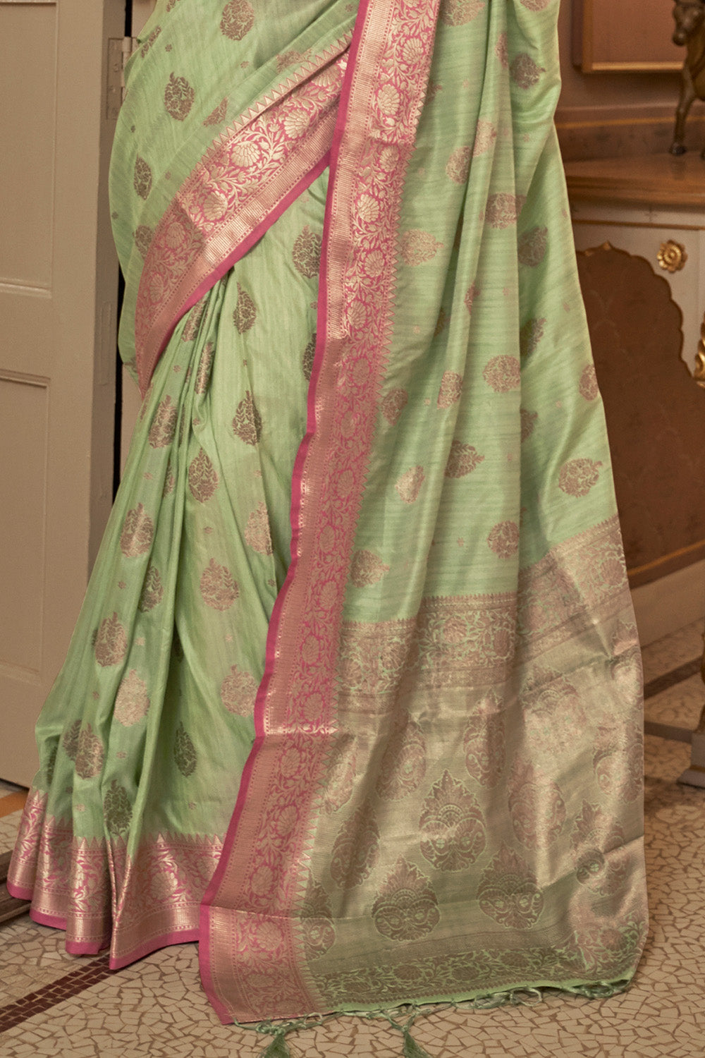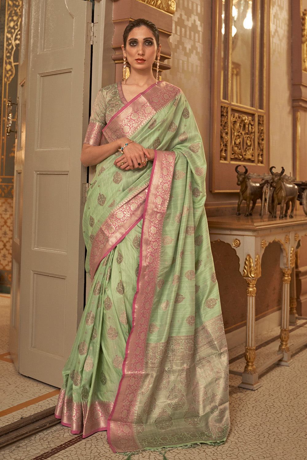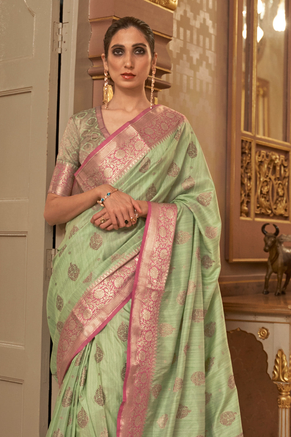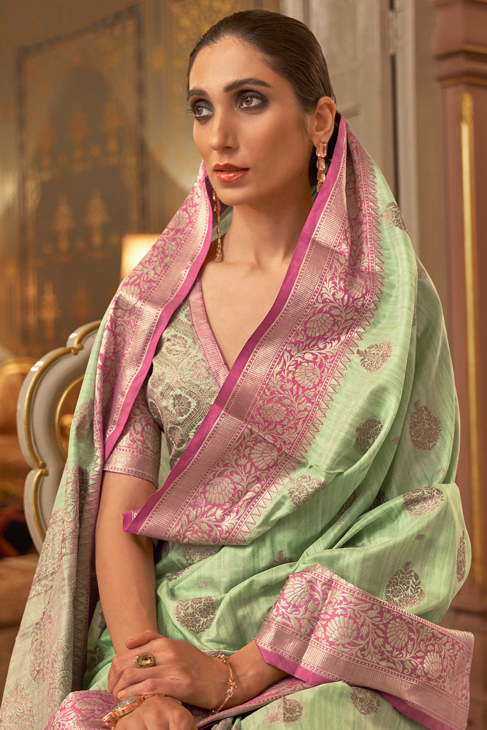 This exquisite cotton saree adorned with zari brocades is a captivating masterpiece that emanates grace and elegance. Crafted from soft and breathable cotton fabric, it ensures optimal comfort even during extended wear. The intricate zari brocades delicately embellish the saree, adding a touch of shimmer and glamour that elevates its beauty to unprecedented levels. The golden threads of the zari brocade intricately intertwine with the muted tones of the cotton, creating a mesmerizing contrast that catches the eye. Thanks to its lightweight nature, the saree effortlessly drapes, making it a versatile choice suitable for both formal and casual occasions. The amalgamation of traditional cotton fabric and exquisite zari brocades makes it an essential addition to any saree collection, symbolizing timeless elegance and style.