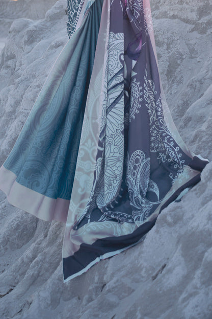 Powder Blue Floral Print Satin Silk Saree